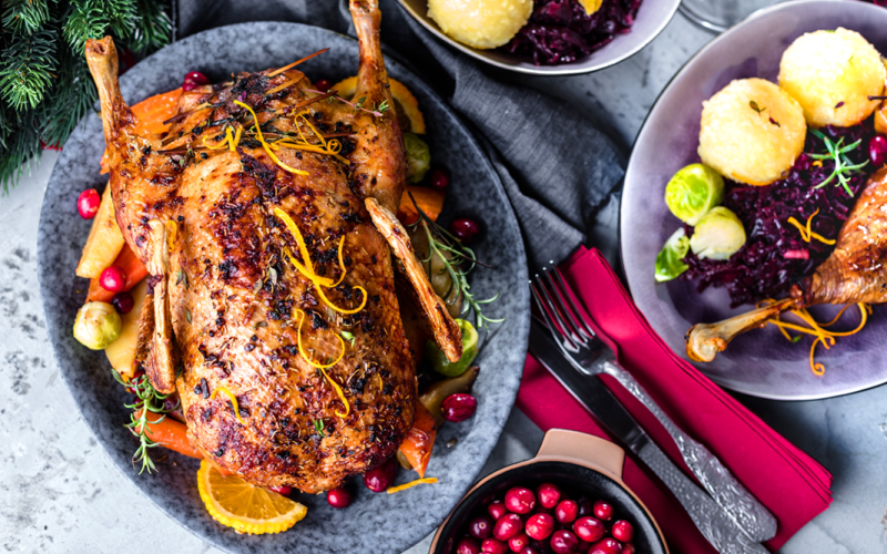 Ganze, schmackhaft gefüllte Martinsgans, im Ofen gegart, anschließend tranchiert und auf der Platte serviert mit gefülltem Bratapfel, Rotkohl, Kroketten und Kartoffelklößen.